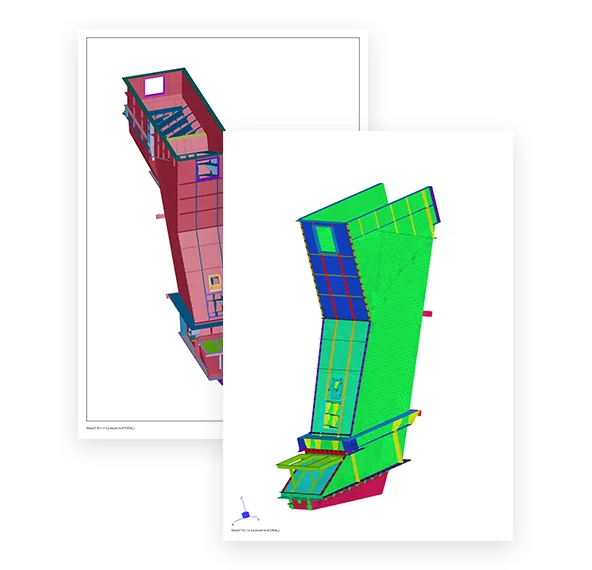 Realizujemy zaawansowane zagadnienia inżynierskie z wykorzystaniem metody elementów skończonych. Naszą specjalizacją są analizy nieliniowe pozwalające na precyzyjne określenie nośności konstrukcji wykraczających poza typowe rozwiązania i schematy. Obliczenia wykonujemy zgodnie z europejskimi lub krajowymi normami zapewniając wymagane bezpieczeństwo.